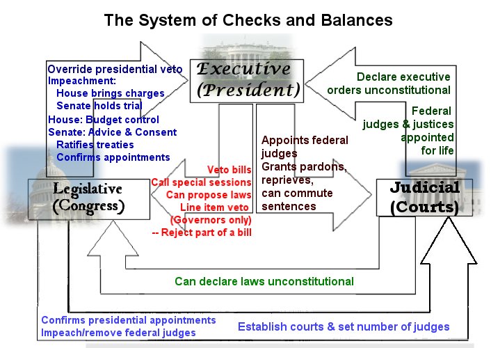 The picture provided above is a great graphic to show how each branch of government is "checked" by the other so that no one branch can be accused of abusing its power in the government over another branch.